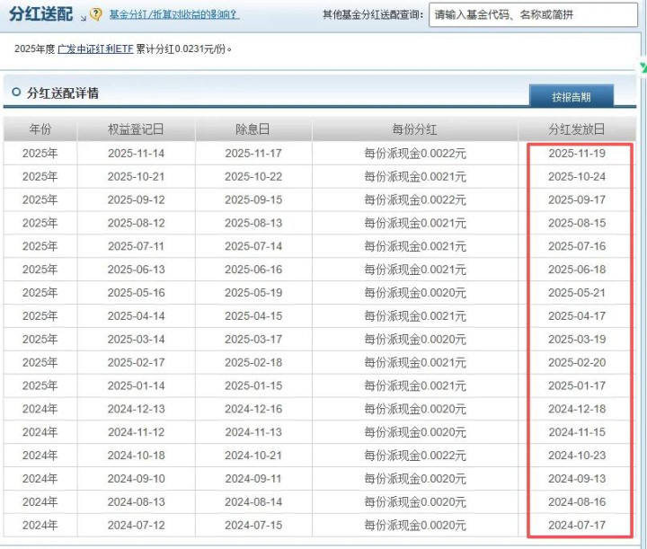 比如中证红利指数里面的,广发中证红利ETF,2024年3月成立的,2024年7月就开始了月月分红,到今年11月,已经连续17个月分红,算是挺稳定的了。
