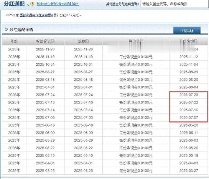 而从分红频次来看,分得最密的是一只股票基金,西部利得央企优选,年内分红17次之多,单单7月就分了4次,比发工资还勤快。
