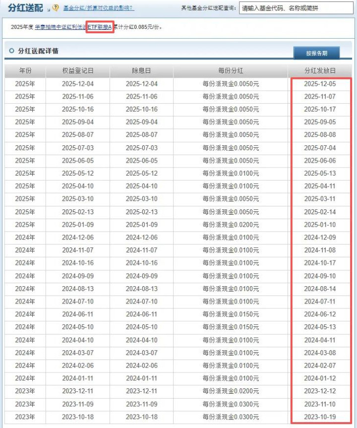 比如华泰柏瑞中证红利低波ETF联接A,2023年10月开始,就已经是月月分红了,到现在一直没断过,连续27个月分红。